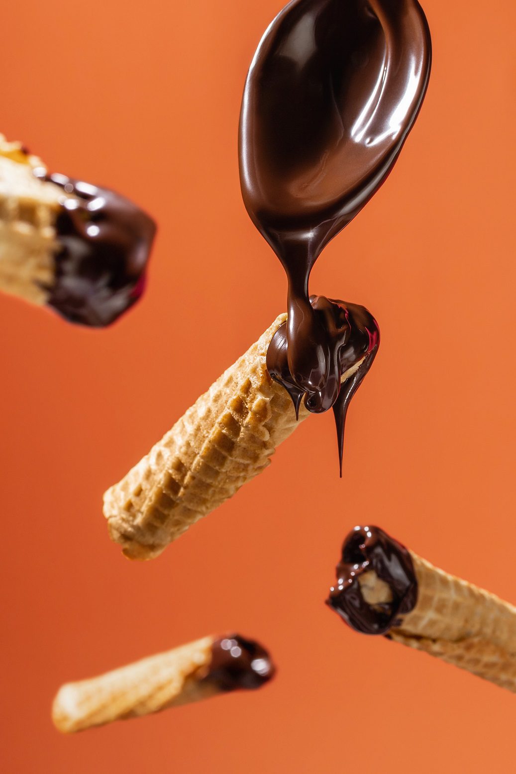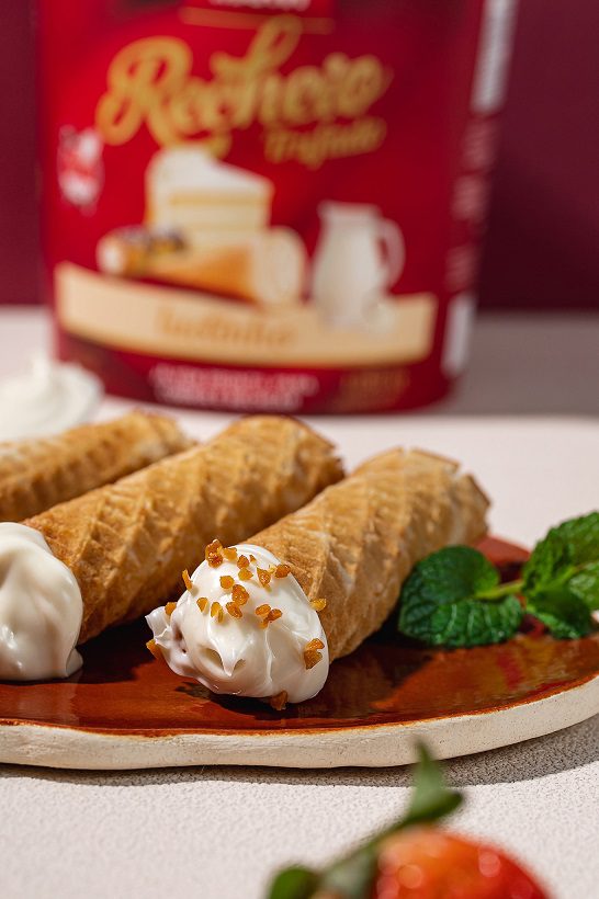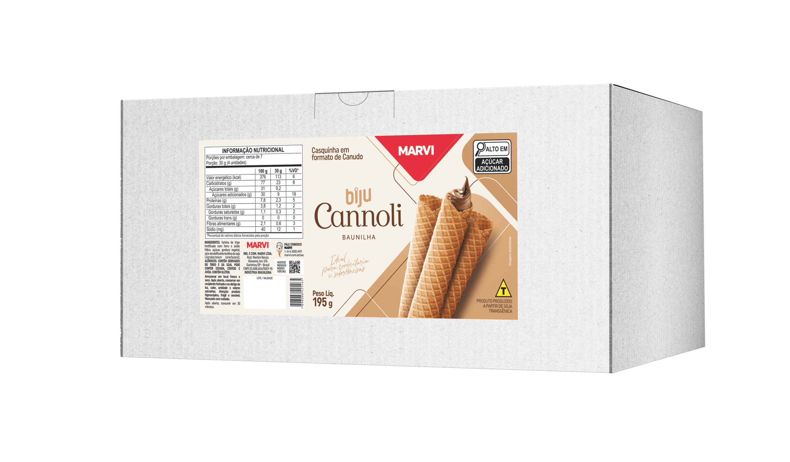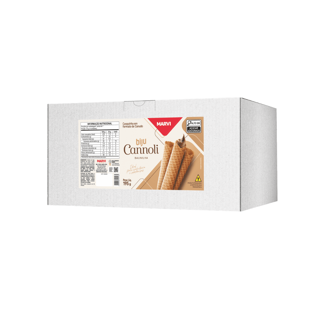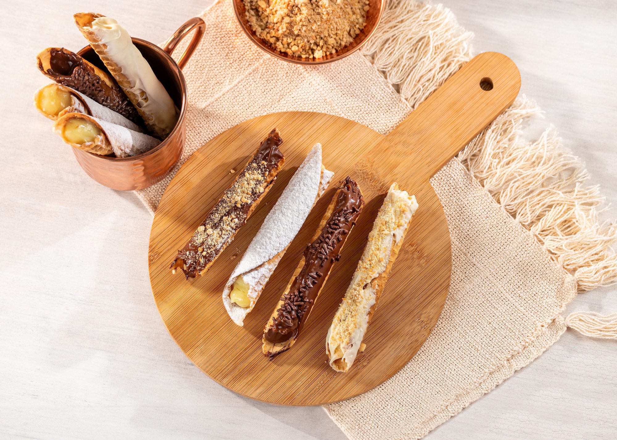 Casquinhas Biju Cannoli, com aproximadamente 8 a 10 cm de comprimento, enroladas em um formato diferenciado para serem recheadas com marshmallow, creme confeiteiro, doce de leite ou o que mais desejar.