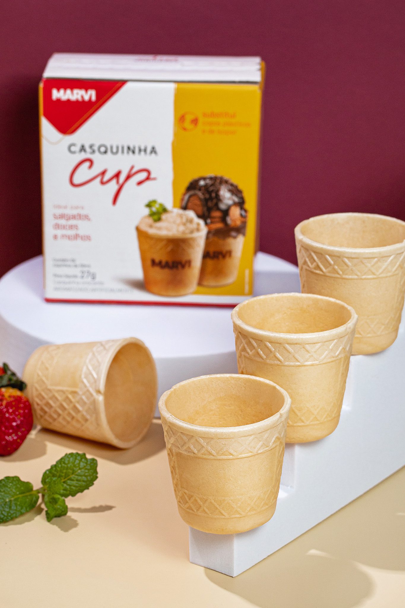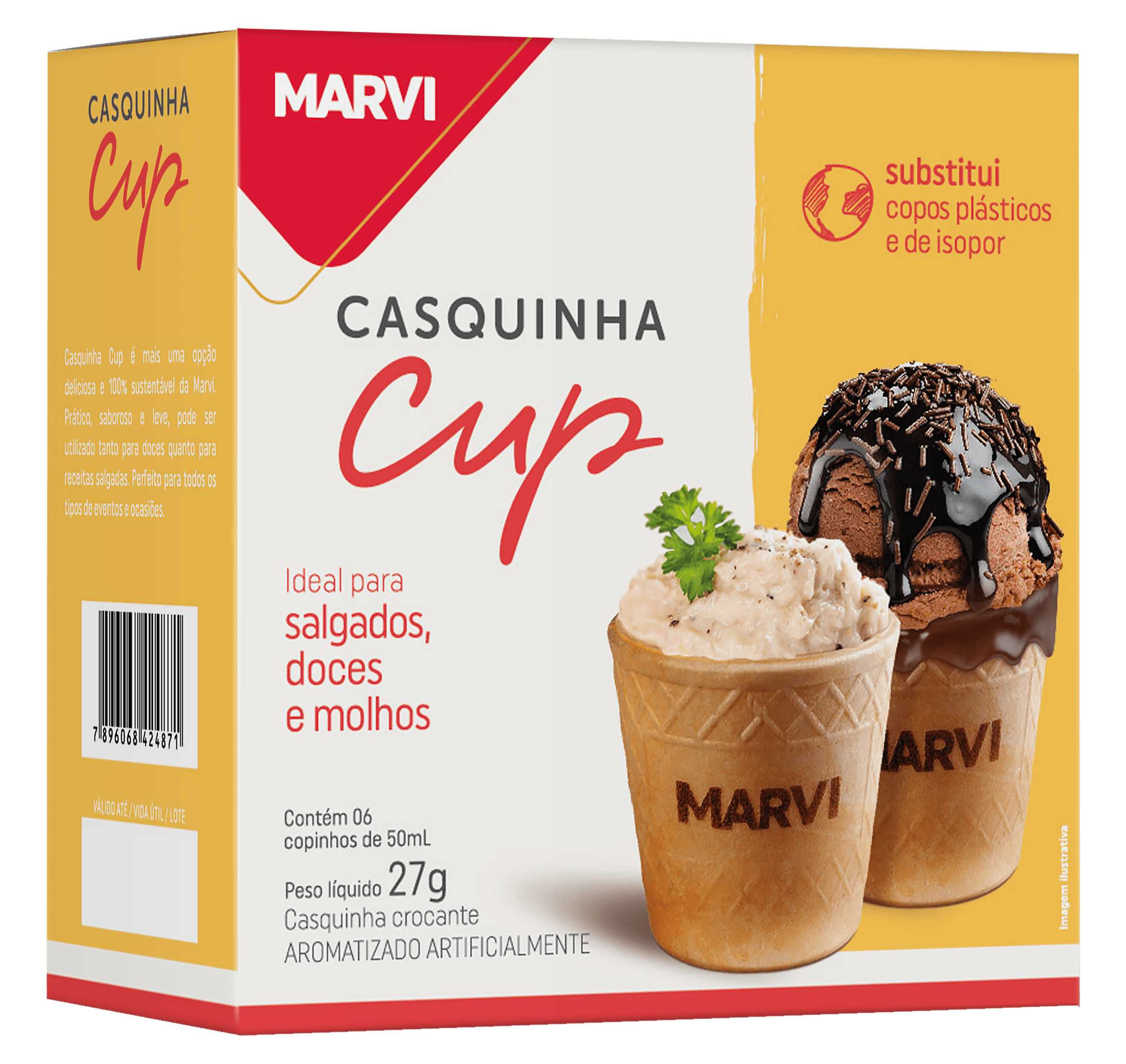 A Casquinha Cup 50 ml é uma casquinha de sorvete com formato de copinho comestível criada pela Marvi. Ela combina a textura crocante típica das casquinhas com um sabor mais neutro. Esse copinho de 50 ml foi pensado para substituir pequenos recipientes descartáveis, permitindo que você consuma bebidas ou sobremesas e, depois, coma o próprio copinho como um complemento saboroso.