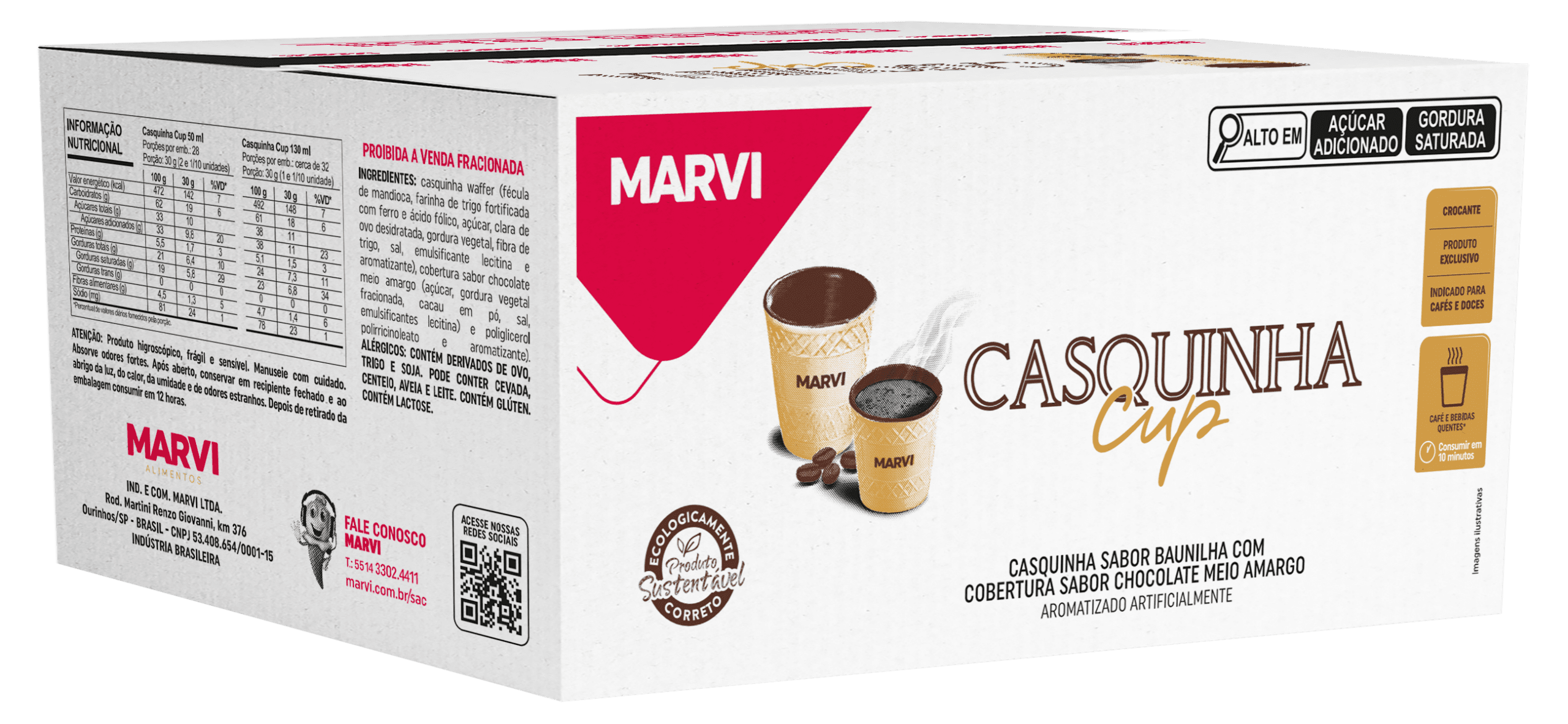 A Casquinha Cup é uma casquinha de sorvete com formato de copinho comestível criada pela Marvi. Ela combina a textura crocante típica das casquinhas com um revestimento interno de chocolate (na versão Cafés) ou com sabor mais neutro (na versão “Salgados e Doces”). Esse copinho de 50 ml foi pensado para substituir pequenos recipientes descartáveis, permitindo que você consuma bebidas ou sobremesas e, depois, coma o próprio copinho como um complemento saboroso.