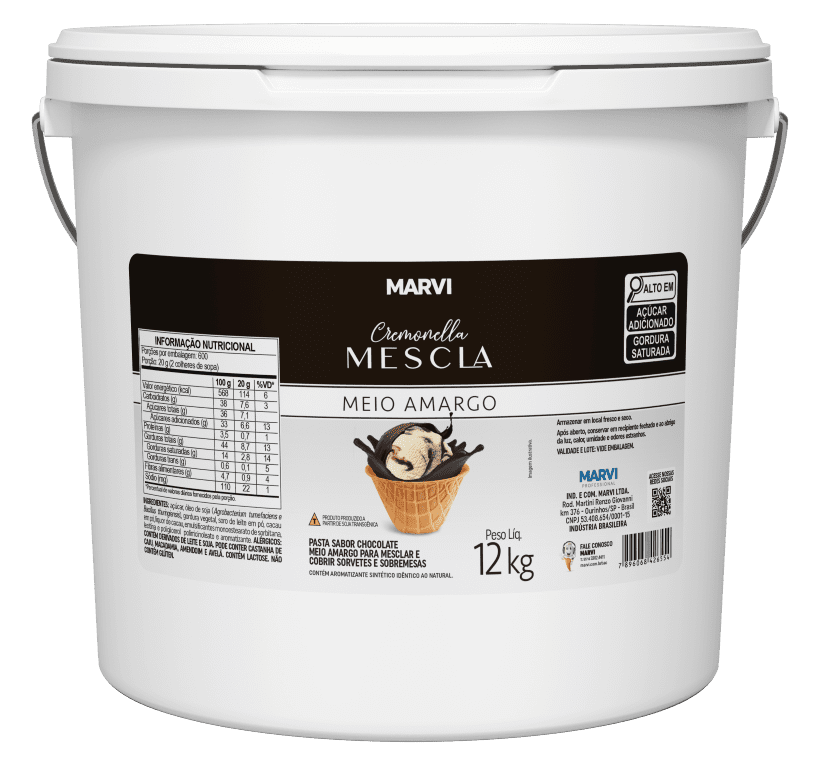 A Mescla Chocolate meio amargo Marvi é um produto elaborado a base de açucar, gordura vegetal e leite. O produto se apresenta em forma de pasta fluida. Produto pronto para utilização. Pode ser misturado com a massa do sorvete para proporcionar aparência de mesclado. Também pode ser usado em picolés e sobremesas.