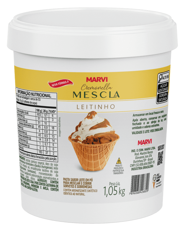 A Mescla Leitinho Marvi é um produto elaborado a base de açucar, gordura vegetal e leite. O produto se apresenta em forma de pasta fluida. Produto pronto para utilização. Pode ser misturado com a massa do sorvete para proporcionar aparência de mesclado. Também pode ser usado em picolés e sobremesas.