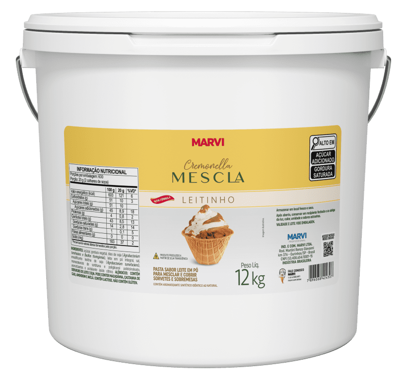 A Mescla Leitinho Marvi é um produto elaborado a base de açucar, gordura vegetal e leite. O produto se apresenta em forma de pasta fluida. Produto pronto para utilização. Pode ser misturado com a massa do sorvete para proporcionar aparência de mesclado. Também pode ser usado em picolés e sobremesas.